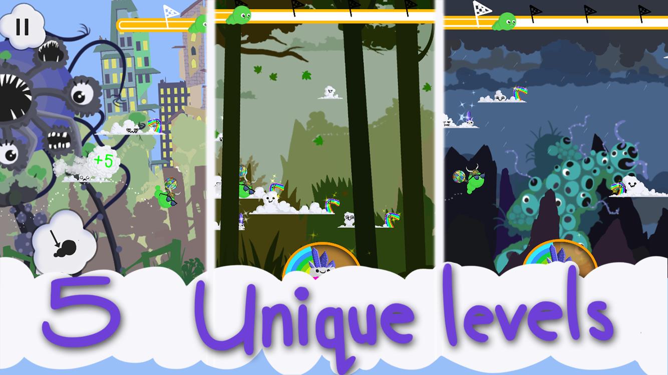 ارتد نفسك من خلال الكون الرائع البصري الذي يسكنه الوحوش السحابية الرائعة حيث يتم كسر قوس قزح السعيد من قبل وحش الأثير وتحطم حول المملكة.